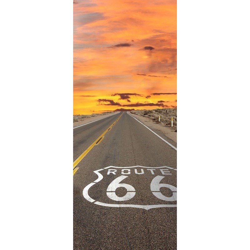 Crea ambientes únicos con nuestro adhesivo para puertas atardecer en la ruta 66, fabricado con una impresión de alta calidad sobre vinilo adhesivo