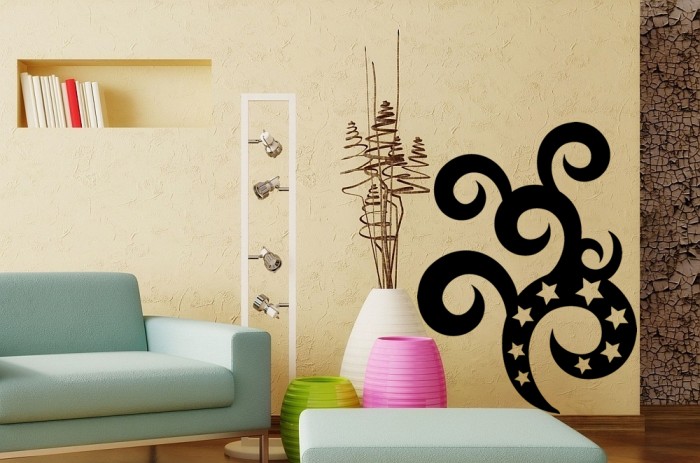 ![]() | Composición: El adhesivo se divide en 3 partes diferenciadas: 1.- Papel soporte o papel siliconado. 2.- El adhesivo (el dibujo que queda en la pared). 3.- Máscara o transportadora. La transportadora se usa para colocar el diseño en la superficie deseada, quitándose luego. Terminación final. Los diseños no tienen fondo, es decir una vez colocados el fondo es la superficie donde los hemos aplicado. Están diseñados especialmente para decoración de interiores usando exclusivamente colores mates. Se obtiene la mayor adherencia a las 48 horas después de su colocación. |